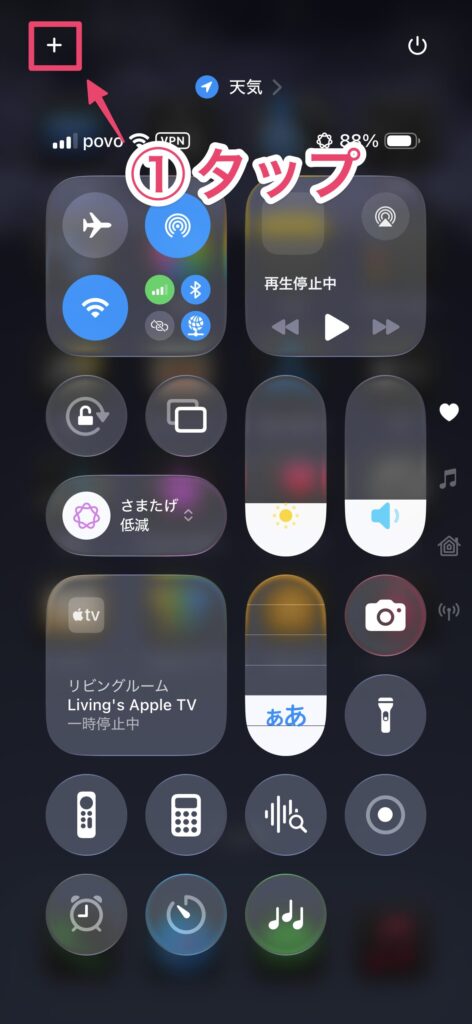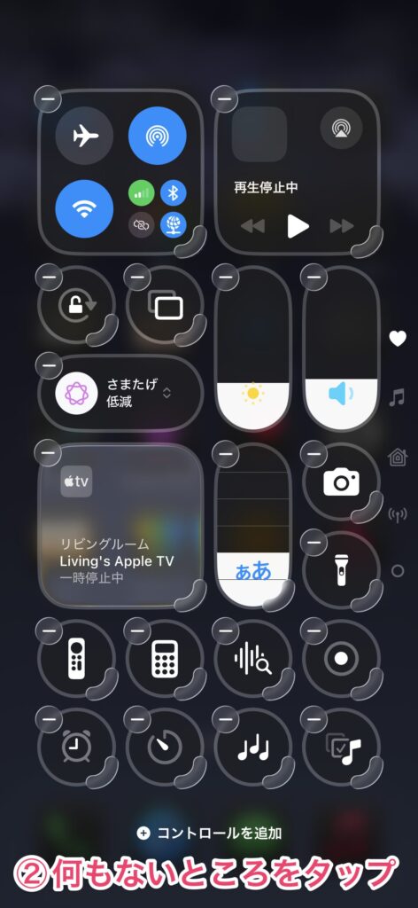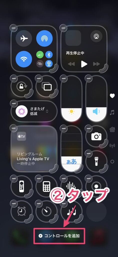 まず、コントロールセンターを開いたら、画面左上の「+」をタップします(または何もないところを長押しします)。編集モードに切り替わるので、「コントロールを追加」をタップします。