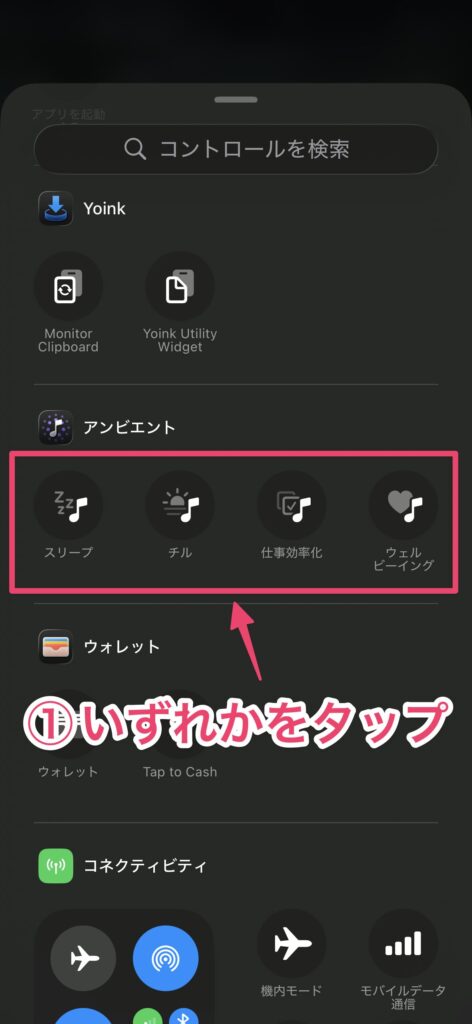コントロールを追加画面が表示されるので、「アンビエント」セクションにあるいずれかのプリセットをタップします。コントロールセンターにプリセットが追加されるので、アイコンをタップします。
