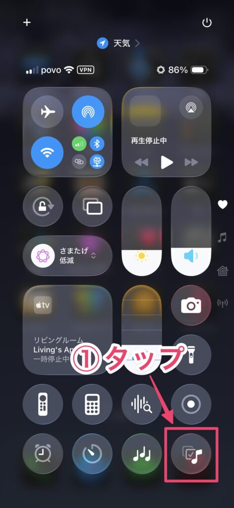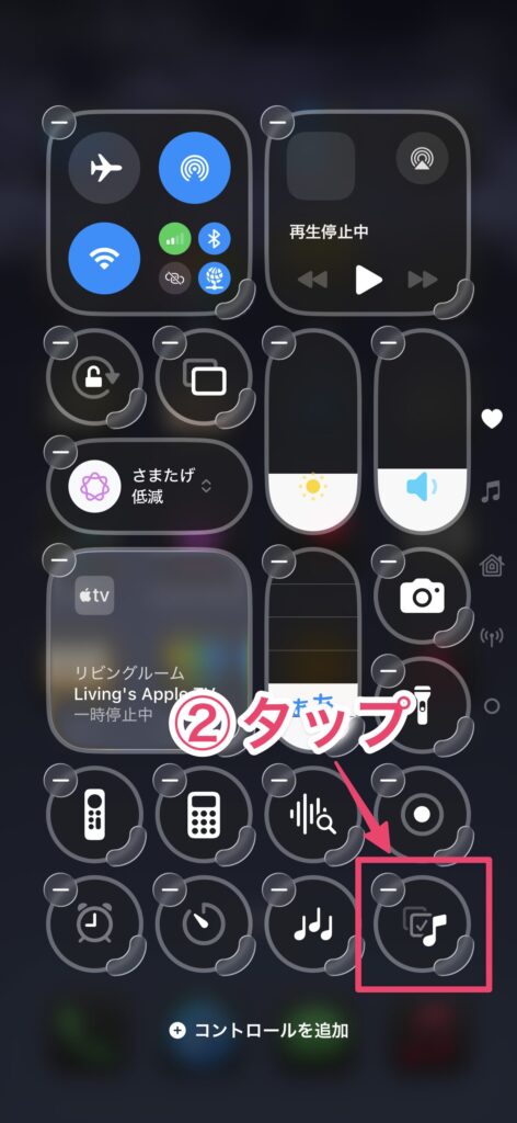 このコントロールセンターには、自分がよく使う機能をカスタマイズして追加できる仕組みがあります。今回紹介する方法では、この機能を活用してプレイリストのショートカットを作成していきます。