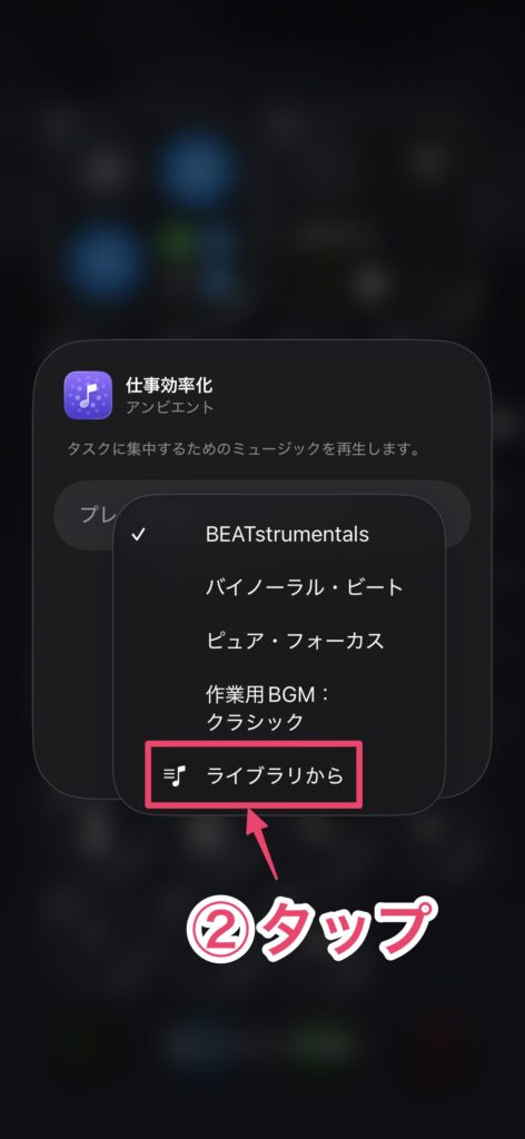 ちなみに、アンビエント機能の元々の環境音楽プレイリストに戻したい場合は、前述した手順で、ライブラリからではなくAppleが用意したプリセットを選び直せばOKです。