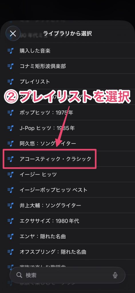 現在選択中のプレイリスト名をタップし、「ライブラリから」を選択します。