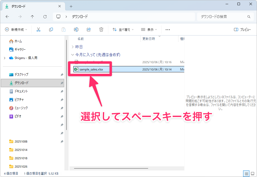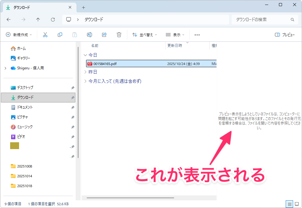 このメッセージが出ると、ファイルの中身がプレビュー表示されません。ダブルクリックして開けば内容は確認できますが、いちいち開くのは正直面倒です。