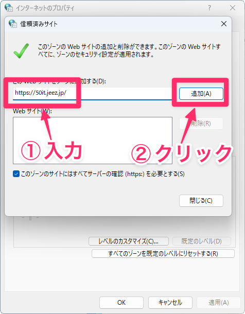 信頼できるサイトのURLを入力し、「追加」をクリックします。