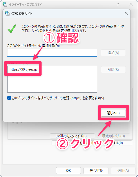 サイトのURLが追加されたら、「閉じる」をクリックして設定を保存します。