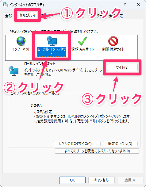 前述の手順で「インターネットのプロパティ」ダイアログを表示したら、「セキュリティ」タブを開き、「ローカル イントラネット」を選択して「サイト」ボタンをクリックします。