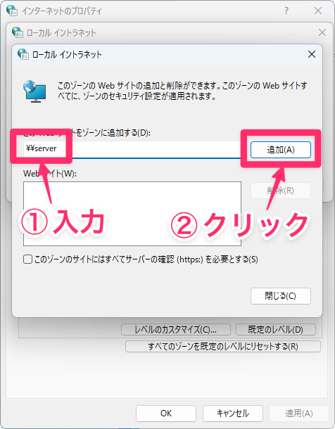 方法3:共有フォルダを「ローカルイントラネット」に登録する