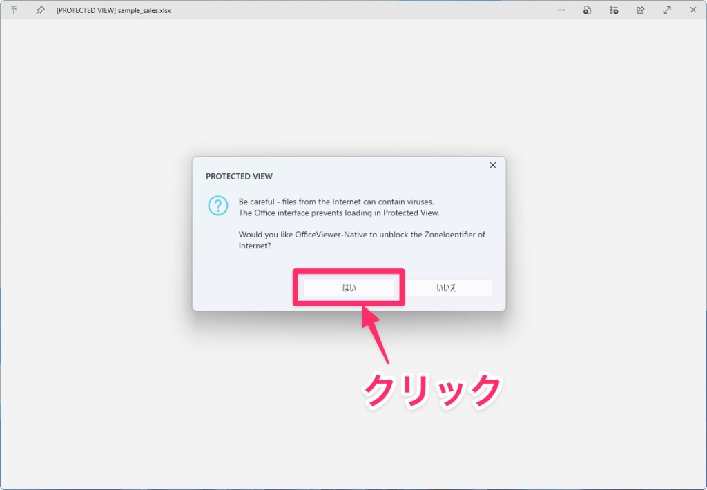 プレビュー前に確認のダイアログが表示されるので「はい」をクリックします。