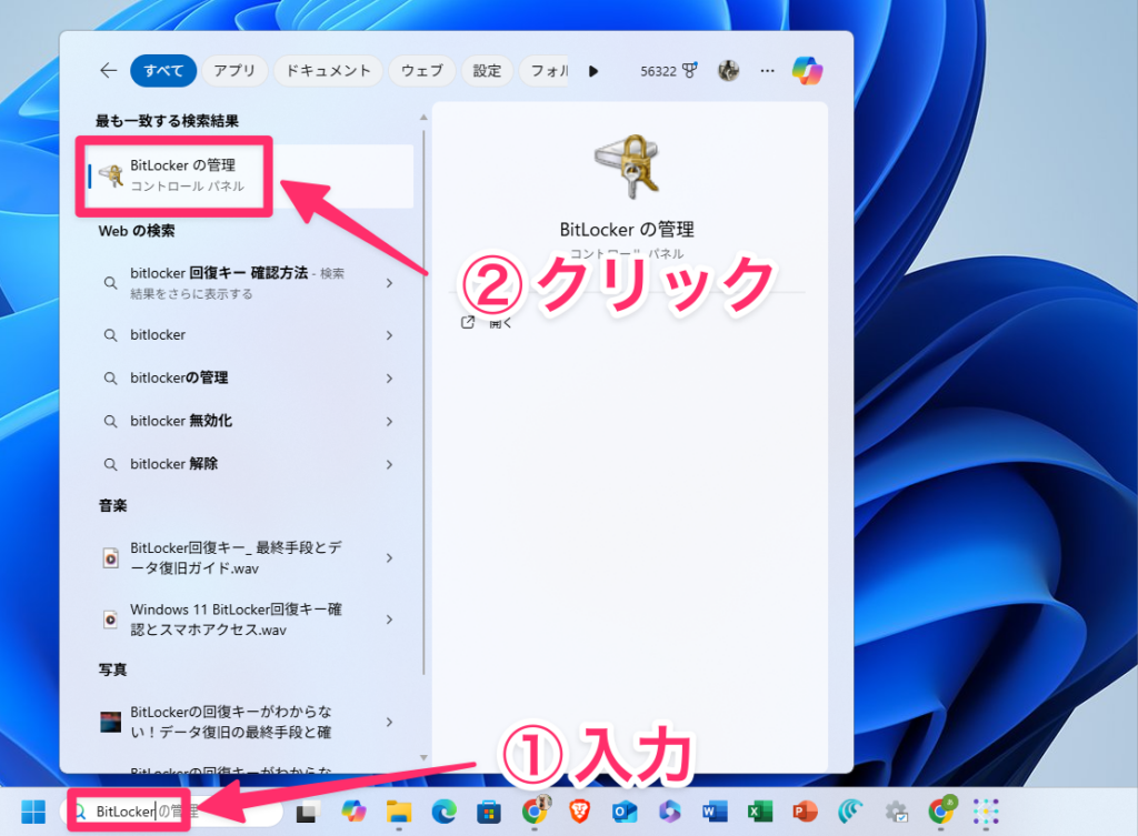 タスクバーの検索ボックスに「BitLocker」と入力し、「BitLockerの管理」をクリックします。