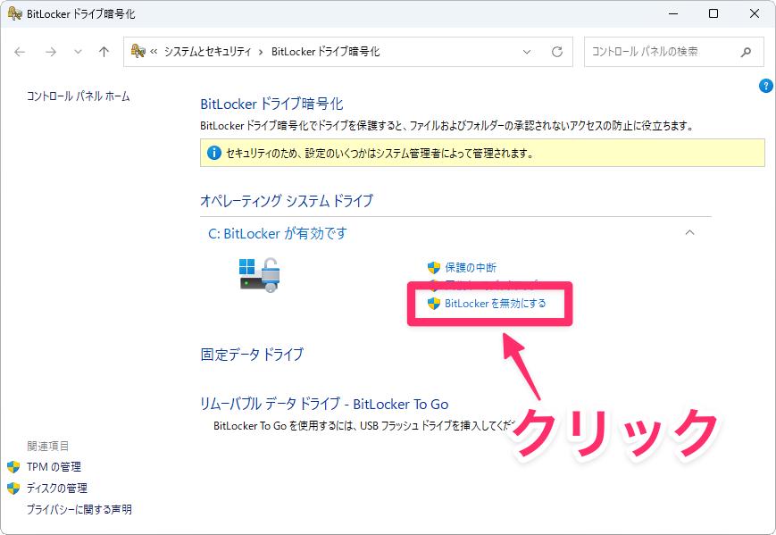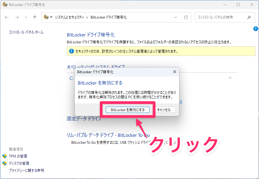BitLockerが有効の場合、「BitLockerが有効です」と表示されています。無効化するには、「BitLockerを無効にする」をクリックします。