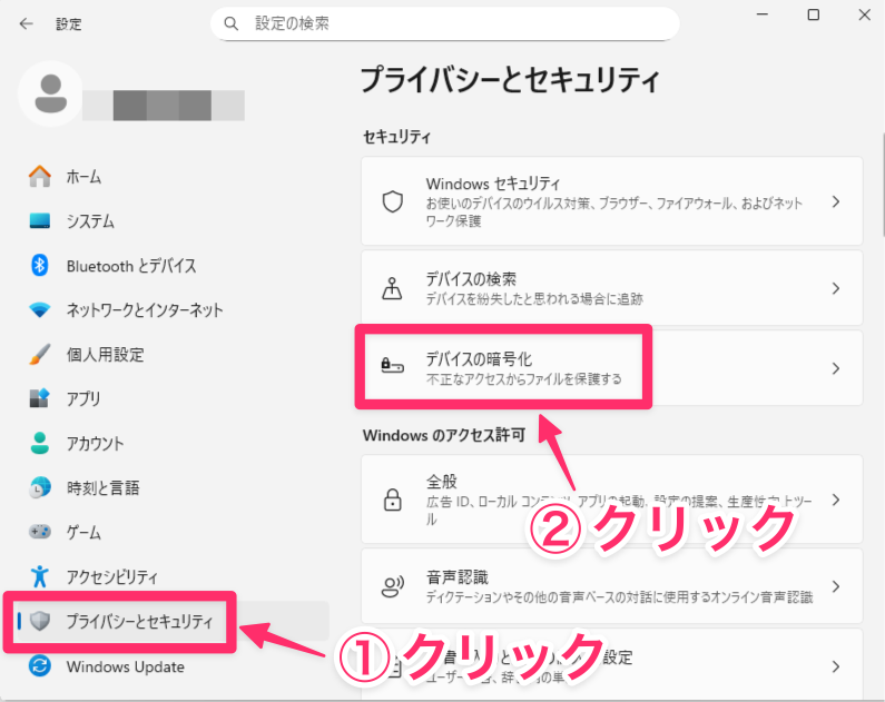 設定アプリを開いたら、「プライバシーとセキュリティ」→「デバイスの暗号化」を開きます。