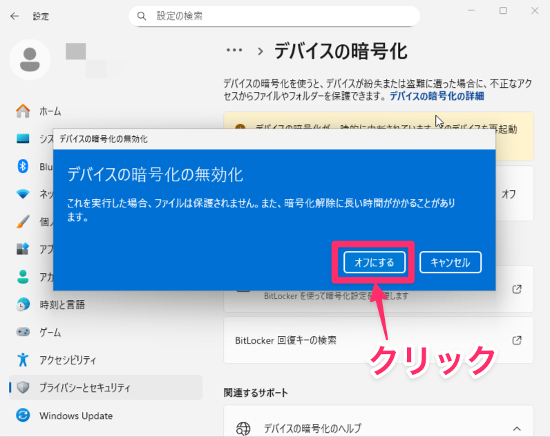 確認のメッセージが表示されるので、「BitLockerをオフにする」をクリックします。