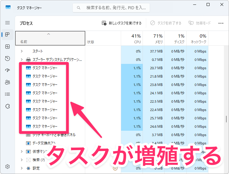 タスクマネージャーのプロセスが増殖すると、どんな問題が起こるのでしょうか。