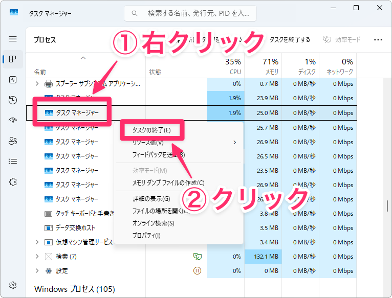 同様の手順で、余分なプロセスを右クリックして終了させてください。この方法は簡単ですが、プロセスが大量に溜まっている場合は少し手間がかかりますね。
