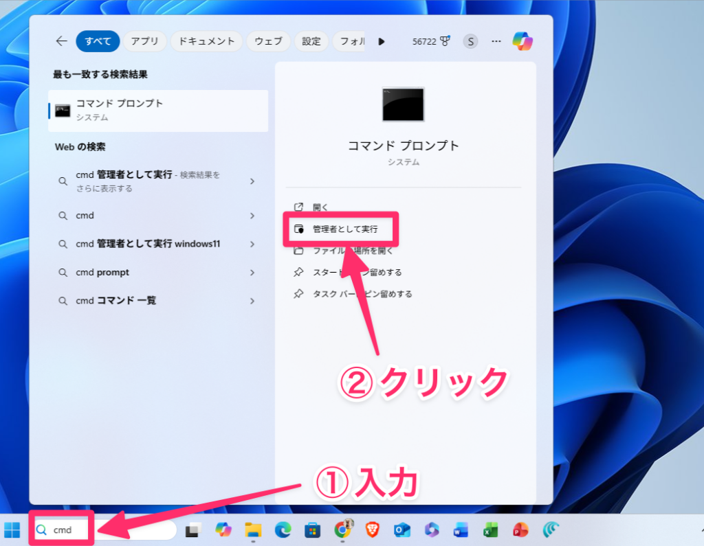 タスクバーの検索ボックスに「cmd」を入力。表示されたコマンドプロンプトの「管理者として実行」をクリックします。