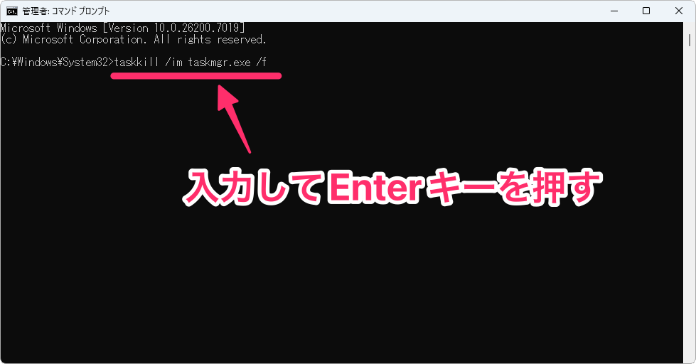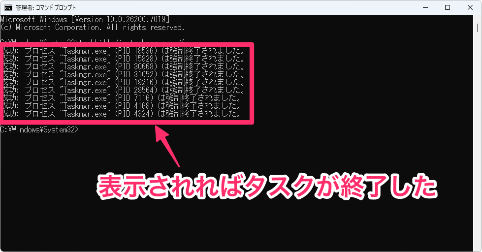 「成功:プロセス”Taskmgr.exe”(PID 4324)は強制終了されました。」と表示されれば、バックグラウンドで動作している全てのタスクマネージャープロセスが一発で終了しています。
