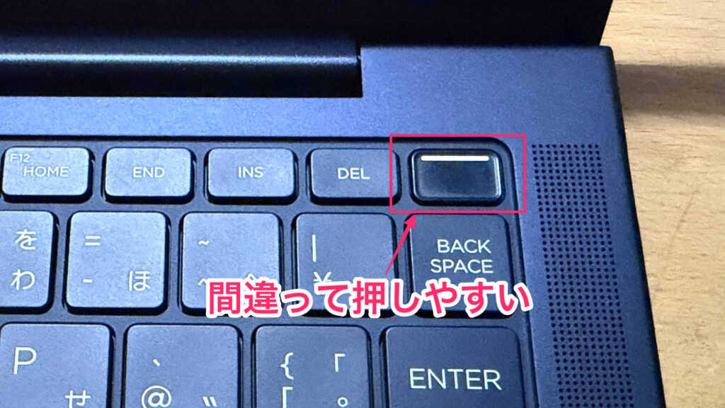 問題なのは、電源ボタンの位置がちょうどDeleteキーやF12キー、BackSpaceキーなどのよく使うキーの近くにあることです。文章を編集している時や、ブラウザでF12キーを使って開発者ツールを開こうとしたときなど、ふとした拍子に電源ボタンに触れてしまいます。