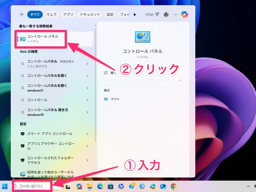 まず、タスクバーの検索ボックスに「コントロール」を入力し、表示されたリストの中の「コントロールパネル」をクリックします。