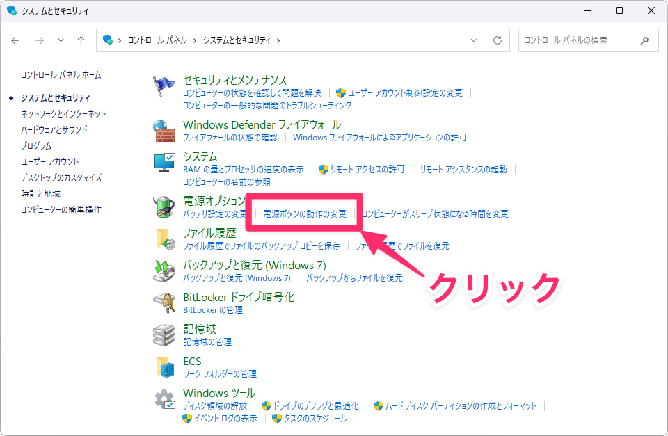 次の画面で「電源ボタンの動作の変更」をクリックします。