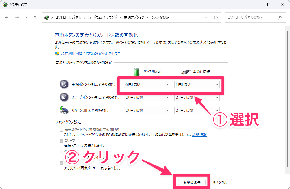 表示された画面の「電源ボタンを押した時の動作」という項目で、「バッテリ駆動」と「電源に接続」の2つの設定をそれぞれ「何もしない」を選択します。設定を変更したら、「変更の保存」をクリックします。