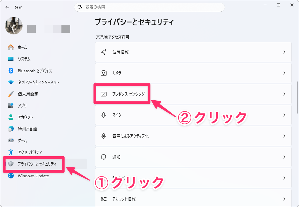 まず、プレゼンスセンシングを有効にします。設定アプリで「プライバシーとセキュリティ」→「プレゼンスセンシング」をクリックします。