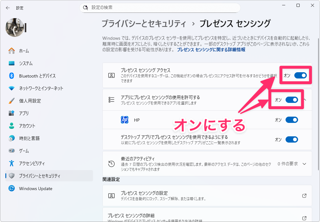 表示された画面の「プレゼンス センシング」と「アプリにプレゼンス センシングの使用を許可する」をオンにします。