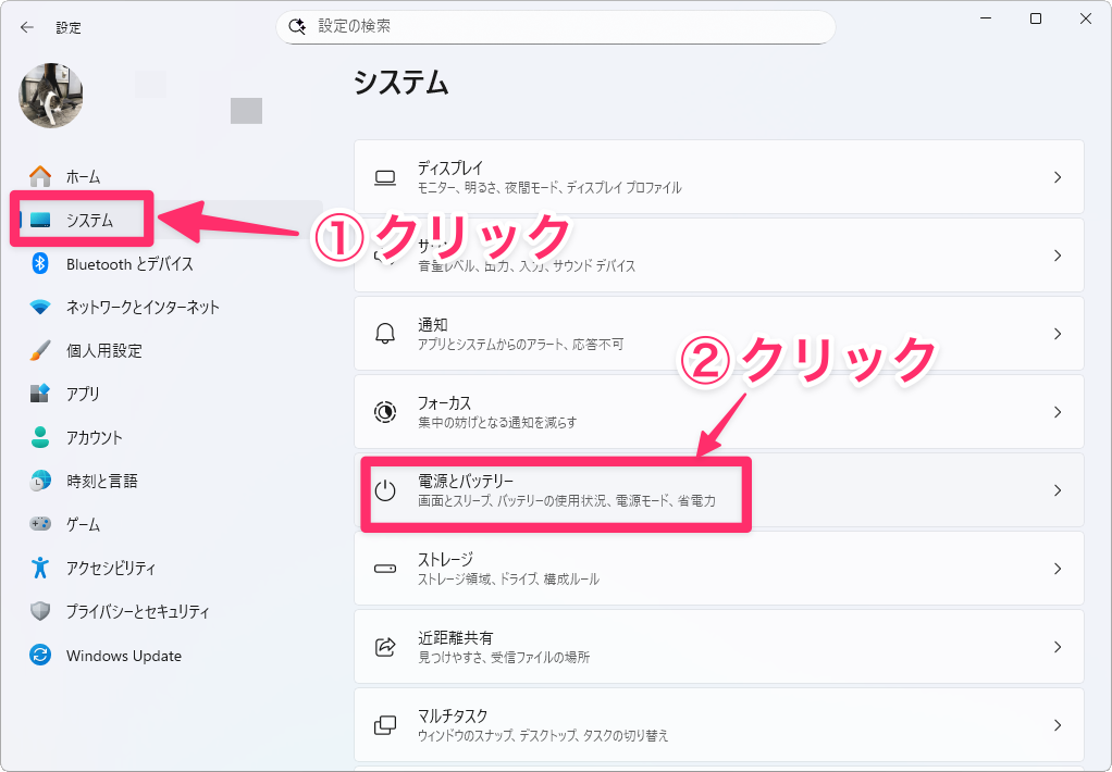 次にプレゼンスセンシングをカスタマイズします。設定アプリで「システム」→「電源とバッテリー」をクリックします。