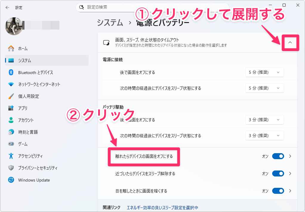 表示された画面で「画面、スリープ、休止状態のタイムアウト」を展開します。項目が表示されるので「