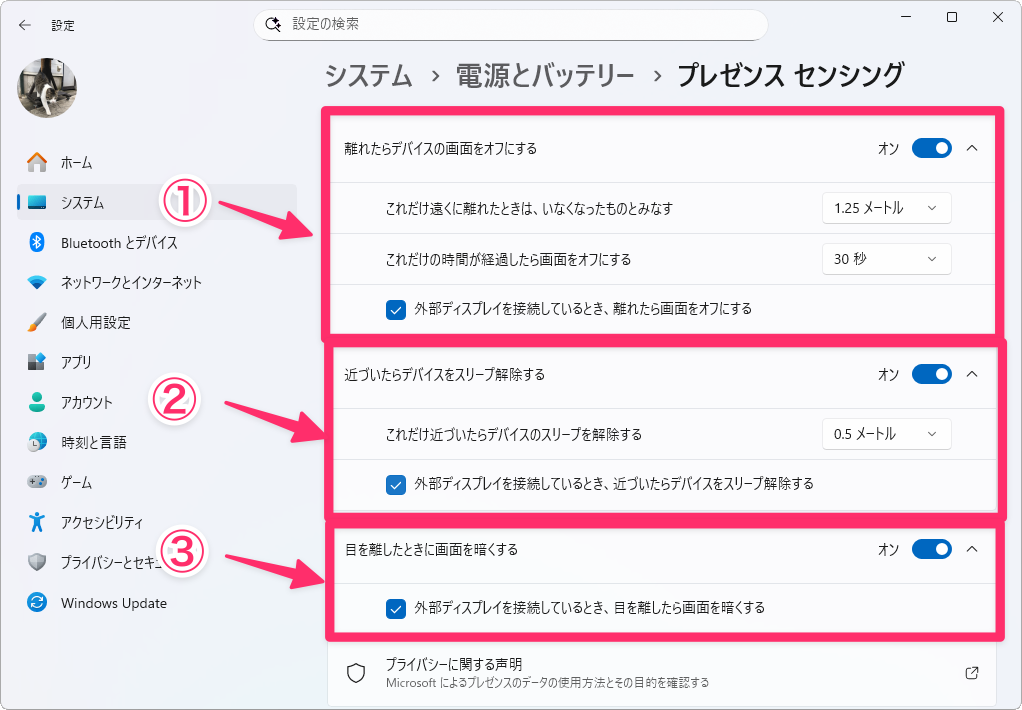 プレゼンスセンシングの設定は、Windowsの設定アプリから行います。手順を見ていきましょう。
