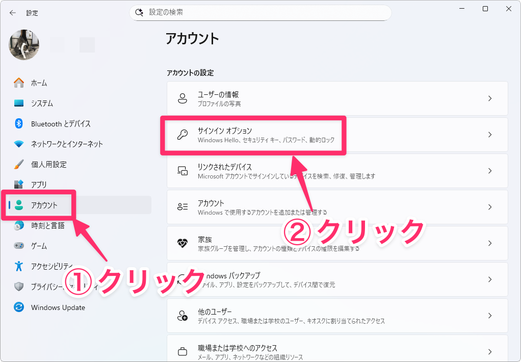 設定を変更するには、設定アプリを開き(Windows + I キー)、「アカウント」→「サインイン オプション」をクリックします。