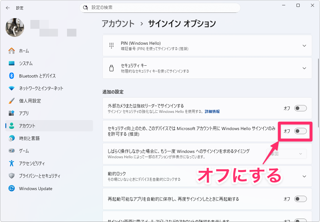 表示された画面で、「セキュリティの向上のため、MicrosoftアカウントではWindows Helloサインインのみを許可する」という項目をオフにします。