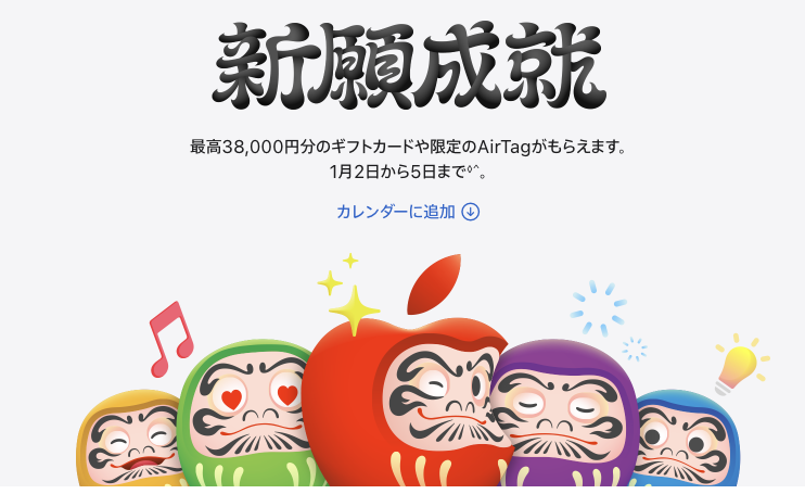 2026年のApple初売りは、ギフトカード最大3万8,000円に加えて、だるまAirTagという限定特典も用意された、年に一度の大きなチャンスです。