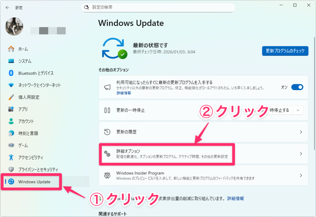 まず設定アプリを開き、「Windows Update」→「詳細オプション」をクリックします。