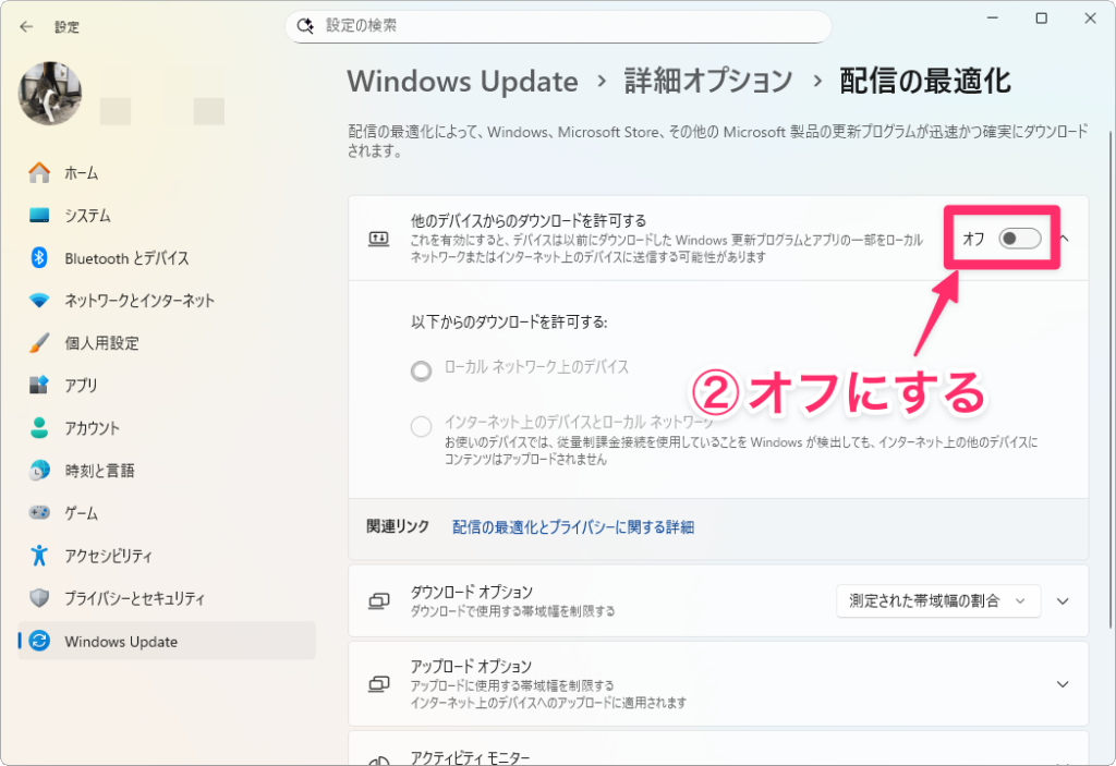 それでは、実際に「配信の最適化」をオフにする手順を見ていきましょう。手順は簡単で、数クリックで完了します。