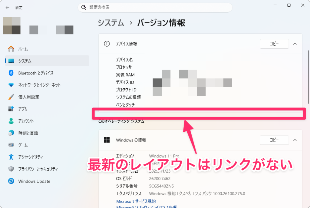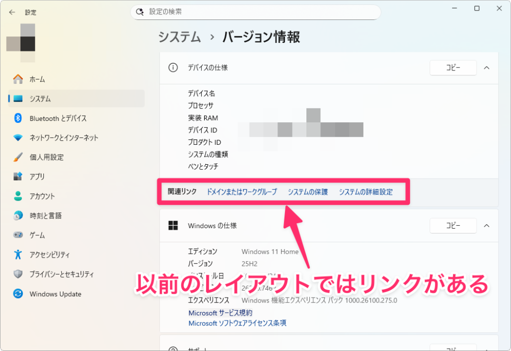 ここで厄介なのが、コントロールパネルの「システム」から飛んでも、最終的には新しい「バージョン情報」画面に着地してしまう点です。つまり、「コントロールパネル経由なら大丈夫かも」という期待も裏切られる形になっており、少なくとも設定アプリやコントロールパネル経由でよく使われていた導線はほぼ使えなくなっているんですよね。