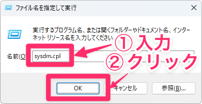 キーボードで「Win」 +「 R」キーを押し、ファイル名を指定して実行を開きます。そこに「sysdm.cpl」と入力して「OK」をクリックします。