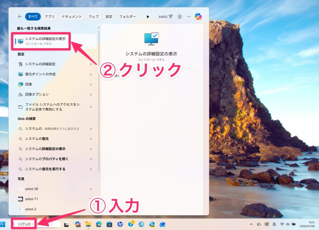 どのキーワードでも、検索結果に「システムの詳細設定の表示」が表示されるはずです。クリックすれば、システムのプロパティが開きます。