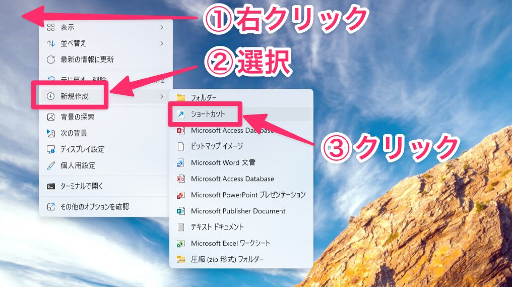 デスクトップ上の何もないところで右クリックし、「新規作成」→「ショートカット」を選択します。