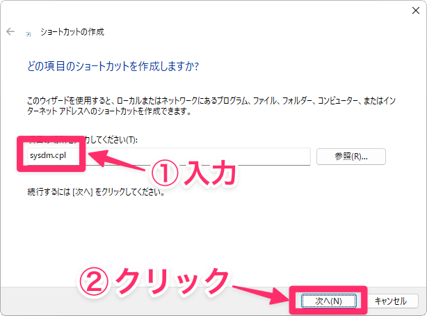 項目の場所に「sysdm.cpl」と入力し、「次へ」をクリックします。