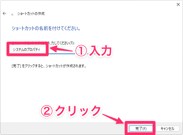 次の画面で名前に「システムのプロパティ」などと入力し、「完了」をクリックします。