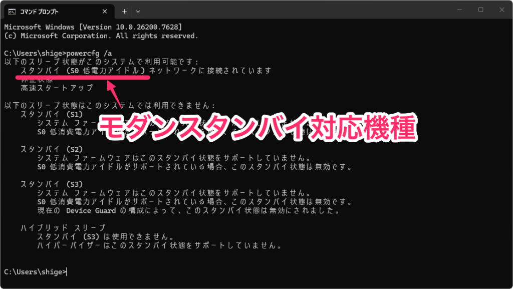 自分のPCがどのスリープ状態に対応しているかは、コマンドプロンプトで powercfg /a と入力すれば確認できます。ここで「スタンバイ (S0 低電力アイドル)」と表示されれば、モダンスタンバイ対応機種です。