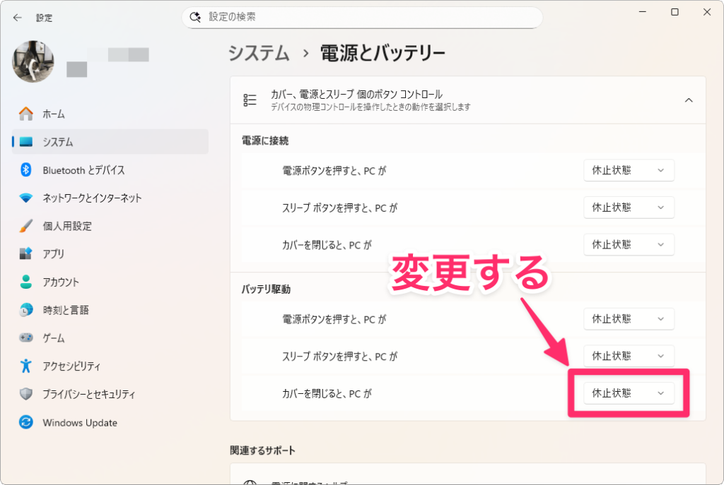 設定するには、設定アプリで「システム」→「電源とバッテリー」を開きます。「カバー、電源とスリープのボタンコントロール」を展開し、「バッテリ駆動」セクションの「カバーを閉じると、PCが」を「休止状態」に変更します。