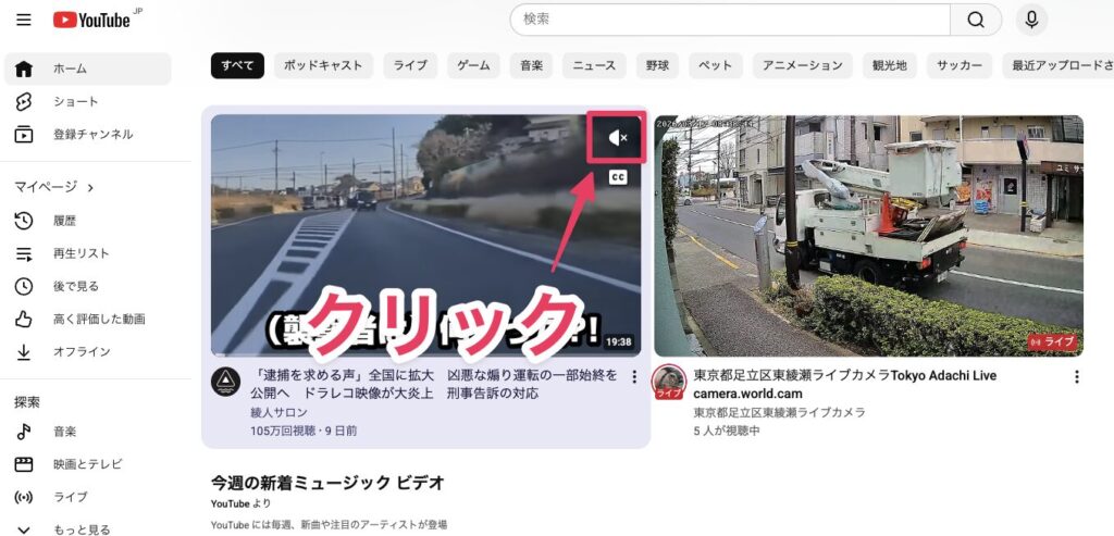 まず、プレビューの音をミュートにする方法。サムネイルにマウスカーソルを合わせると表示されるスピーカーのアイコンをクリックすると、すべてのおすすめ動画のプレビュー再生で音をミュートできます。