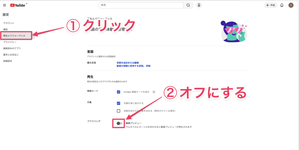 - ③ プレビュー自体を完全にオフにしたい → YouTubeの「設定」→「再生とパフォーマンス」→「動画プレビュー」をオフ